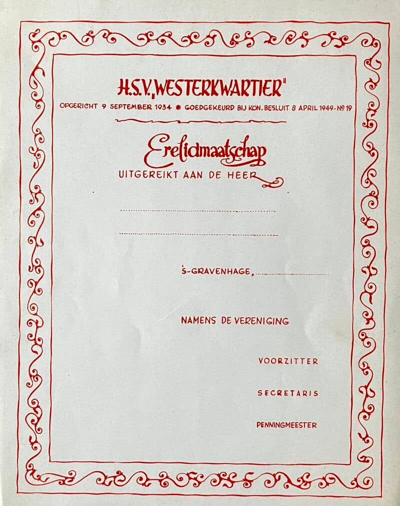Ook uit de Archiefboeken: de oorkonde voor het Erelidmaatschap van HSV Westerkwartier. Opmerkelijk detail: 'goedgekeurd bij Koninklijk Besluit op 8 april 1949'.