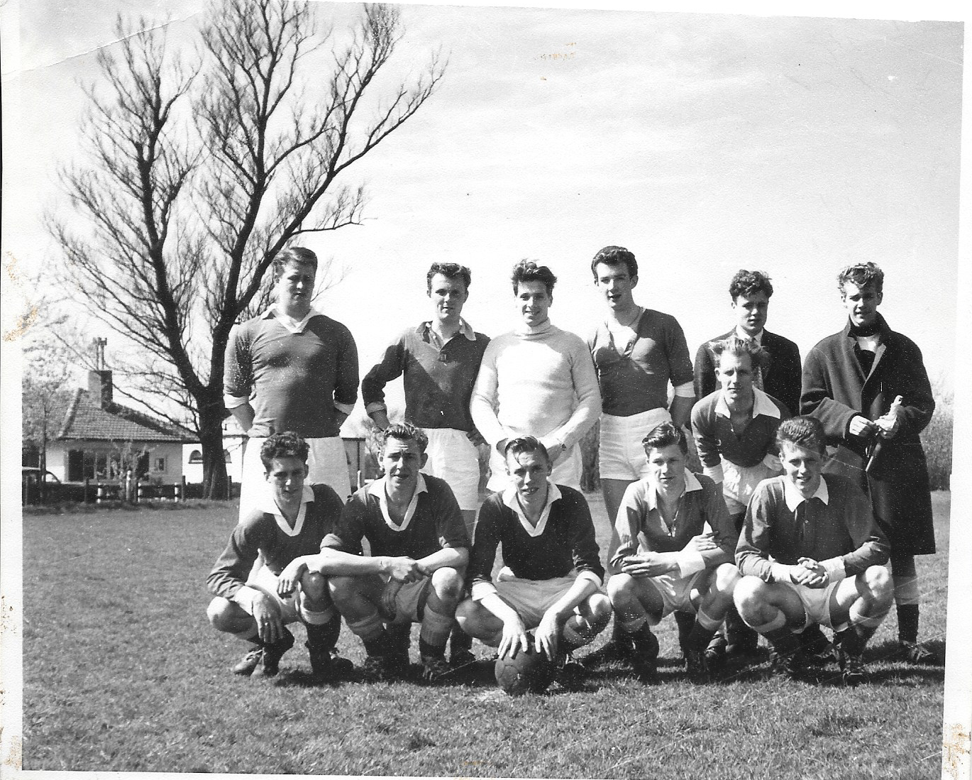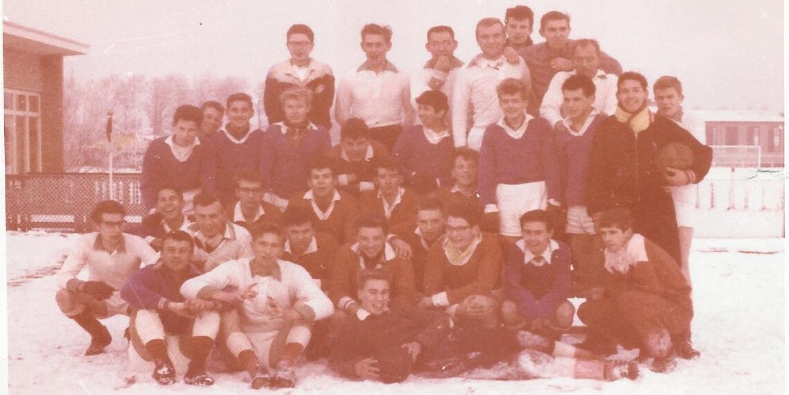 Leuk die sneeuwfoto. Dat deden we regelmatig. Ik sta net voor Hans Velders en ik denk Jaap Korsen. Ben dat mannetje in het blauwe shirt.