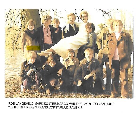 Zeven namen staan onder de foto. Aanvulling van de bruidegom: 'Volgens mij zijn de ontbrekende namen Edwin Bak, Robbert van der Ark en B. van der Harst.'