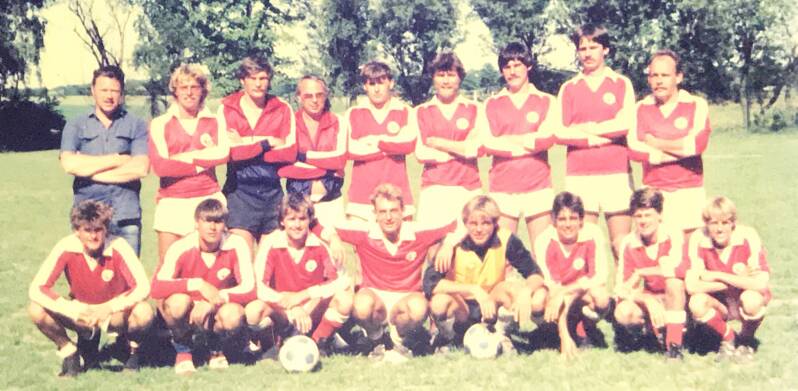 Henk Tramper, gehurkt, als aanvoerder. Westerkwartier-team in Hamburg (1983 of 1984). Vlnr, boven: Anton Willemstein, Ruud Bouman, René van Lingen, Frans van Heesewijck, Cor van der Made, Peter van de Lecq, Dick Tuit, Tinus Langeveld. Onder: Rob Langeveld, Rob Boer, Henk dus, Ton Wegerif, René Kanters, Marcel van der Holst. Zie ook twee Hamburg-video's in de WK-bioscoop.
