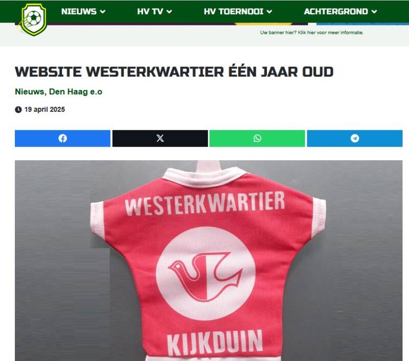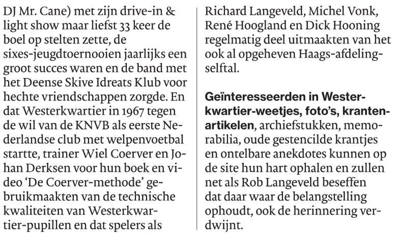 De veel bezochte website Haaglandenvoetbal.nl besteedt aandacht aan het (bijna) éénjarig bestaan van de website 'Westerkwartier-Kijkduin. Toen en Nu'. 'De site van de rood-witte club, die in 1994 werd opgeheven, trok het afgelopen jaar zo’n 7000 bezoekers. Zij verlekkeren zich aan ruim 70 webpagina’s met nostalgische (zwart-wit) foto’s en video’s, archiefmateriaal, relikwieën en herinneringen de ‘Sixes’-toernooien', zo valt onder meer te lezen. Lees het hele artikel: www.haaglandenvoetbal.nl/nieuws/140111/website-westerkwartier-een-jaar-oud/