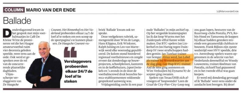 Oud-Westerkwartier-trainer Mario van der Ende schrijft in zijn wekelijkse AD-column op 10 november 2025 over de vermaarde Haagse Courant-rubriek Ballade. Daarin komt, uiteraard, ook Westerkwartier voorbij. In dit geval over de aanstelling van Jan Lobel als trainer.