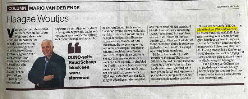 Mario van der Ende kon niet alleen goed fluiten. Hij schrijft ook al jarenlang zeer lezenswaardige columns in AD/Haagsche Courant. Elke maandag haalt hij mooie herinneringen op aan zijn Haagse voetbaljaren. Zoals bij Westerkwartier, waar hij succesvol jeugdtrainer was bij de A-jeugd, eind jaren '70. Hij belicht WK en de huidige WK-website in het AD van 28 oktober 2024. Over zijn internationale scheidsrechtersloopbaan meldt Wikipedia: Van der Ende floot van 1985 tot 2003 meer dan 600 wedstrijden in het Nederlands betaald voetbal waaronder 4 bekerfinales en 4 wedstrijden om de Johan Cruijff-schaal. Hij was internationaal FIFA-scheidsrechter van 1990 tot en met 2002, floot 135 internationale duels, waaronder wedstrijden op het EK 1996, WK 1994, WK 1998, twee Europese Supercups en 54 A-interlands.