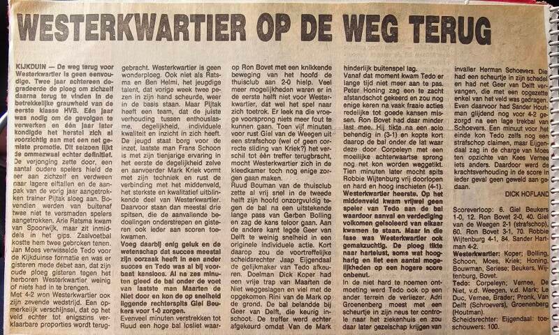Petra van Heesewijck kwam dit fraaie boekwerk tegen in de WK-nalatenschap van Frans, die op 20 februari 2024 overleed. Frans bewaarde een knipselarchief van de artikelen over Westerkwartier 1 in de 1e klasse A in het seizoen 1987/1988). Charles Matla was dat seizoen trainer, Frans de vaste grensrechter/12e man.