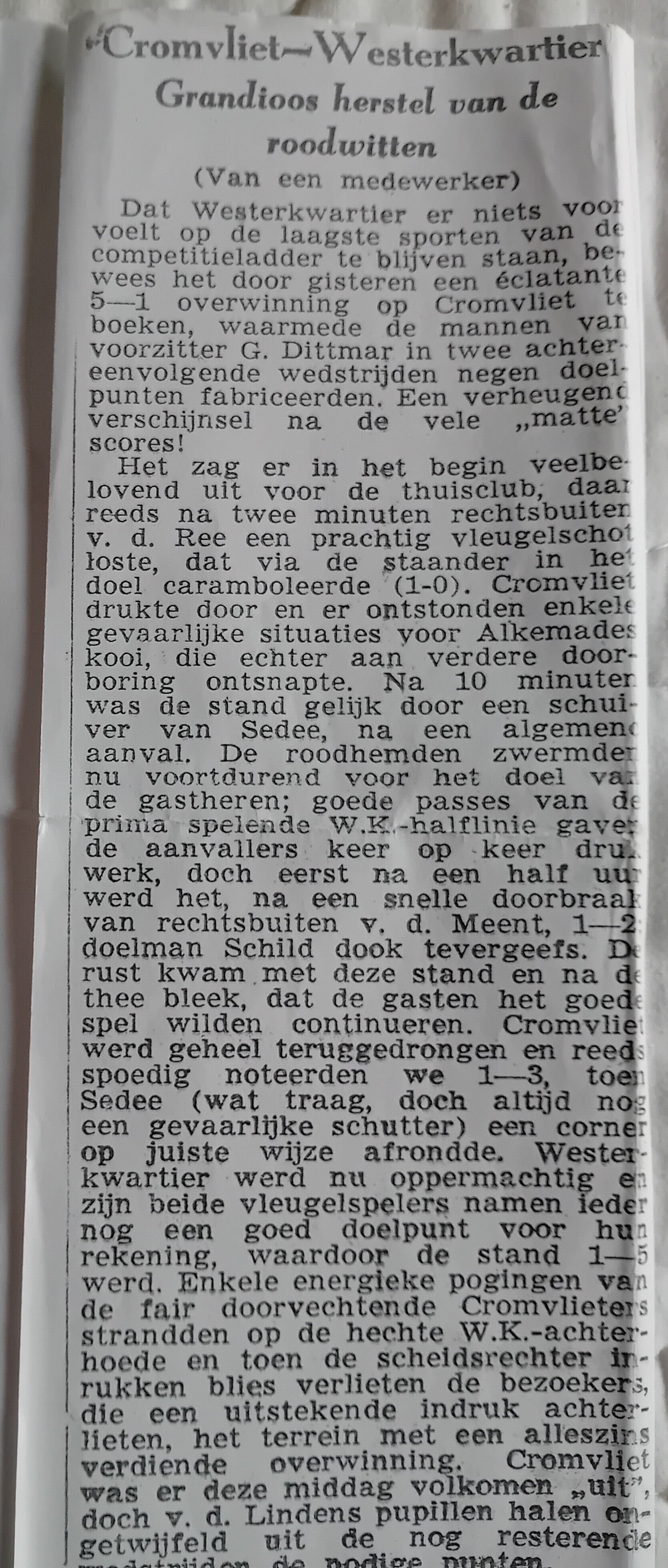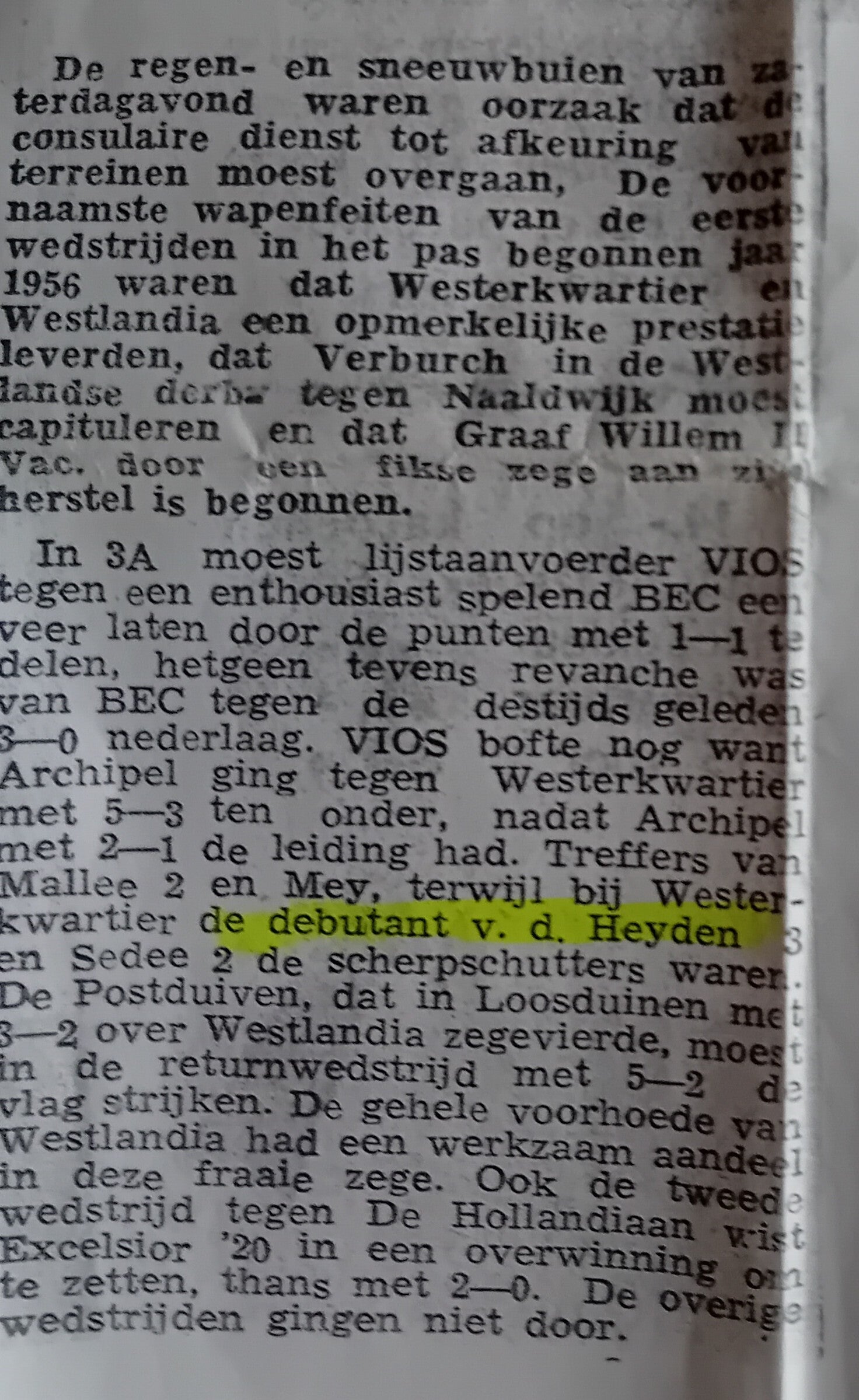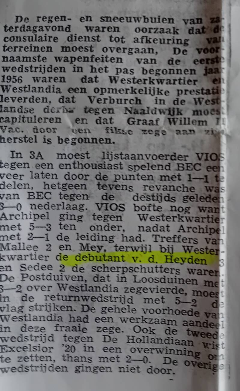 Dochter Yvonne van der Heijden vond twee kranten-artikelen in het archief van haar vader Pieter. Wat blijkt? Pieter scoorde als debutant drie keer! Het andere artikel rept over 'grandioos herstel van de roodwitten'. Jaartal onbekend. 'Het zal rond 1956 geweest zijn.'