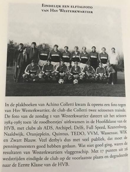 In een boekje over de Haagse Voetbalgeschiedenis staat deze foto, met tekst. Op de foto zijn onder meer herkenbaar, vlnr, boven: Cees Schildkamp, trainer Colletti, Jan Moes (met stropdas!), Robbert van der Togt, Hans Versleyen, Lex Muilwijk, Casper Sterk. Onder: Fred Zandvliet, Richard Langeveld en Dick Hooning. Herken je nog meer gezichten? Vermeld ze svp hieronder!